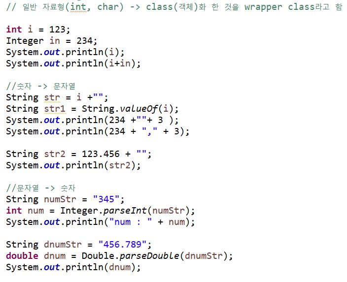 그런 경우에 int num = Integer.parseInt(num); 을 해주면 연산이 가능한 숫자가 되어 탄생합니다. 이런것처럼 wrapper class는 기본 자료형의 객체화를 통해 기본 자료형만으로는 할 수 없는 기능을 할 수 있게 해줍니다. 주의해야 할 부분은 wrapper class를 기본자료형을 대신하기 위해서 쓰지 않는다는 것입니다. wrapper class가 무조건적인 최선책이 아니라 필요할 때만 사용한다는 것을 명심해야겠습니다.