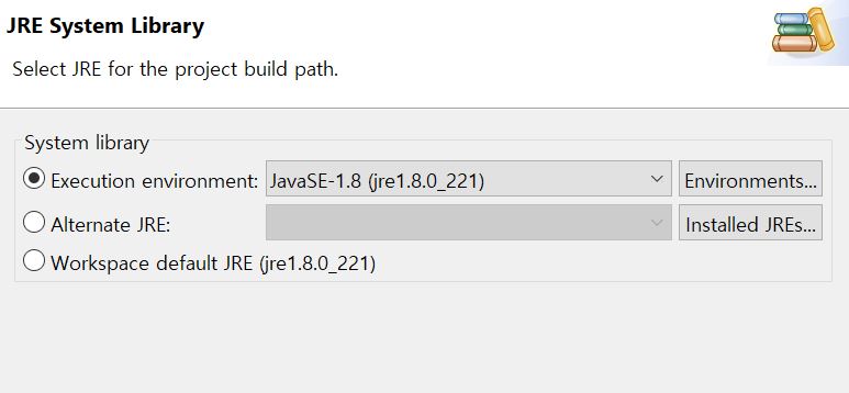 project -> build path -> Libraries -> JRE System Library 클릭 -> apply