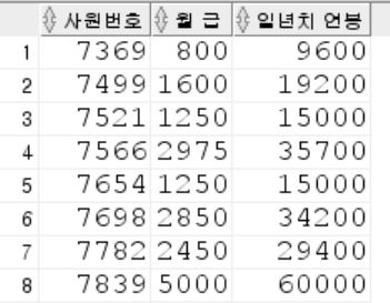 SELECT empno AS 사원번호, ename AS 사원이름, sal AS 월급, sal*12 AS 연봉